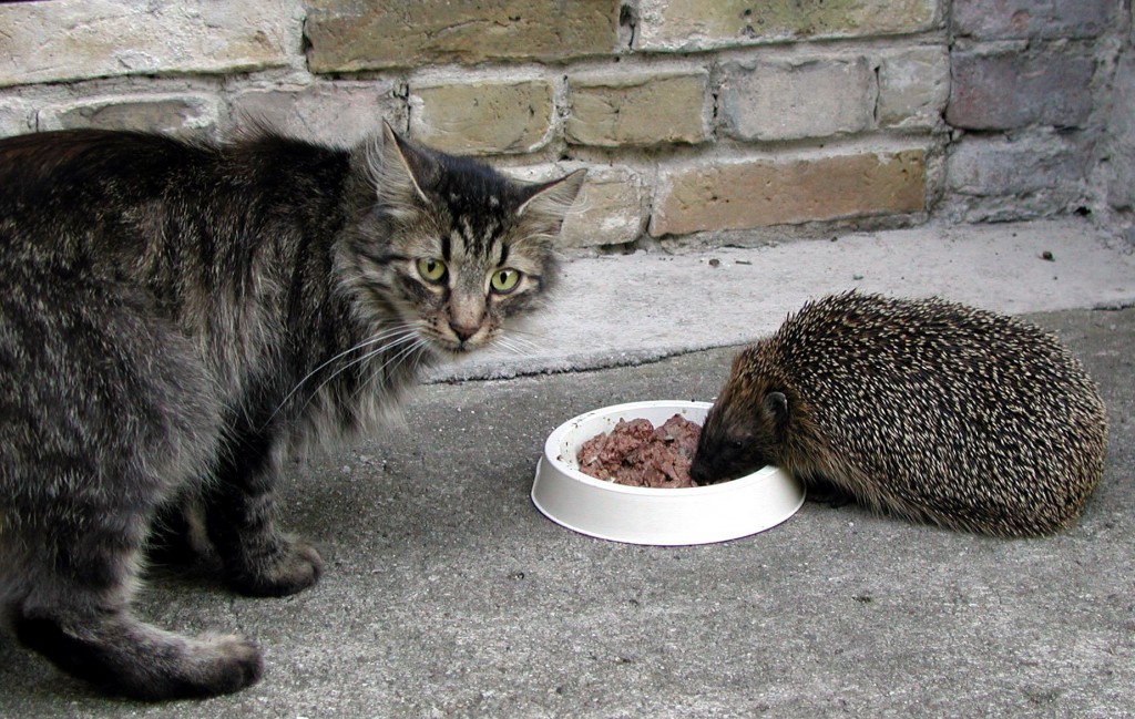 Der Igel verliert während des Winterschlafs rund dreißig Prozent seines Körpergewichts. Darum beginnt das abgemagerte Stacheltier sofort mit der Nahrungssuche. Das erste Mal bemerken Sie ihn vielleicht, wenn er sich an einem milden Aprilabend an den Teller schleicht, den Sie eigentlich Ihrer Katze auf die Garten-Terrasse gestellt haben. Das Stachelkleid des Igels schlottert an den Seiten seines Körpers. Sie dürfen dem klapprigen Gesellen daher ruhig geeignetes Futter (Katzenfutter vermengt mit Weizenkleie oder Haferflocken) hinstellen. Denn es gibt im Frühjahr noch nicht so viele Insekten, Würmer und Schnecken, dass er damit seinen Riesenhunger stillen könnte.